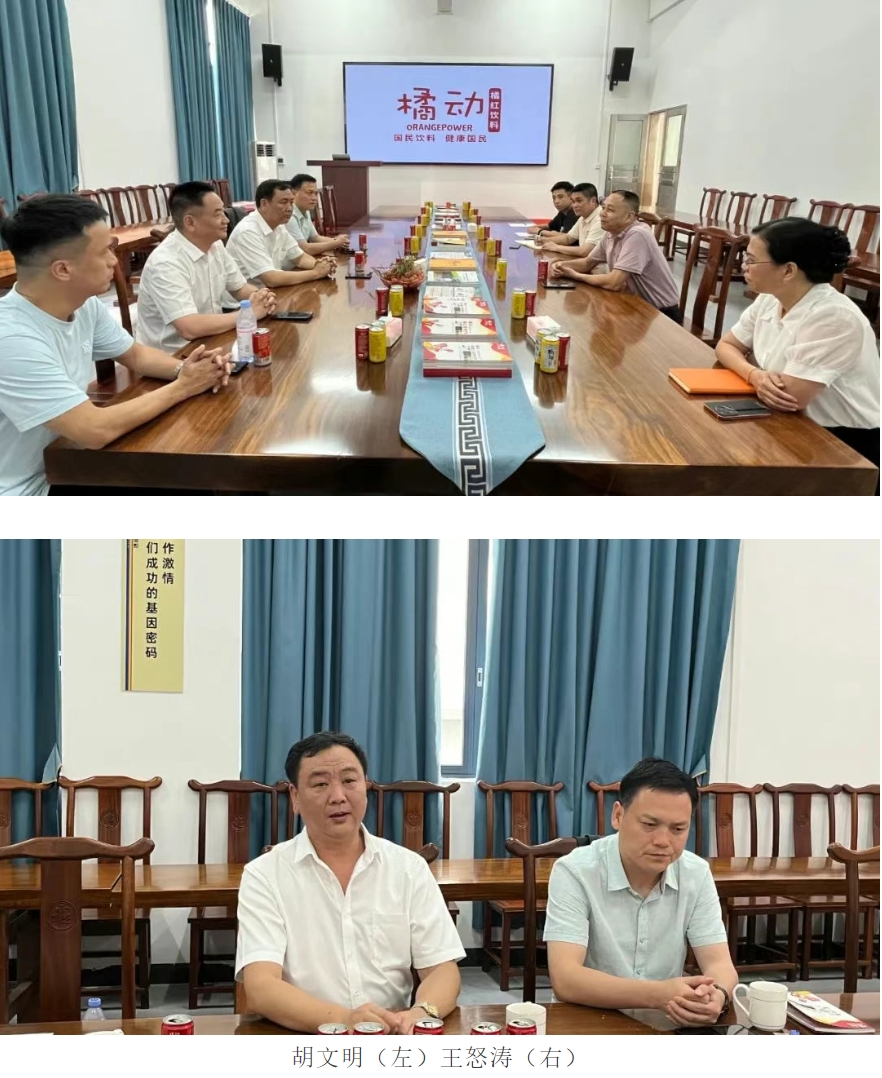 集团董事长梁其佳、总经理黎来凤、营销总经理柯吉等陪同,胡文明胡总、王怒涛王总、刘文正刘总等就橘动饮料线上线下营销合作以及共建咽喉嗓健康科普站二员分销体系等提出了宝贵的建议与意向。
