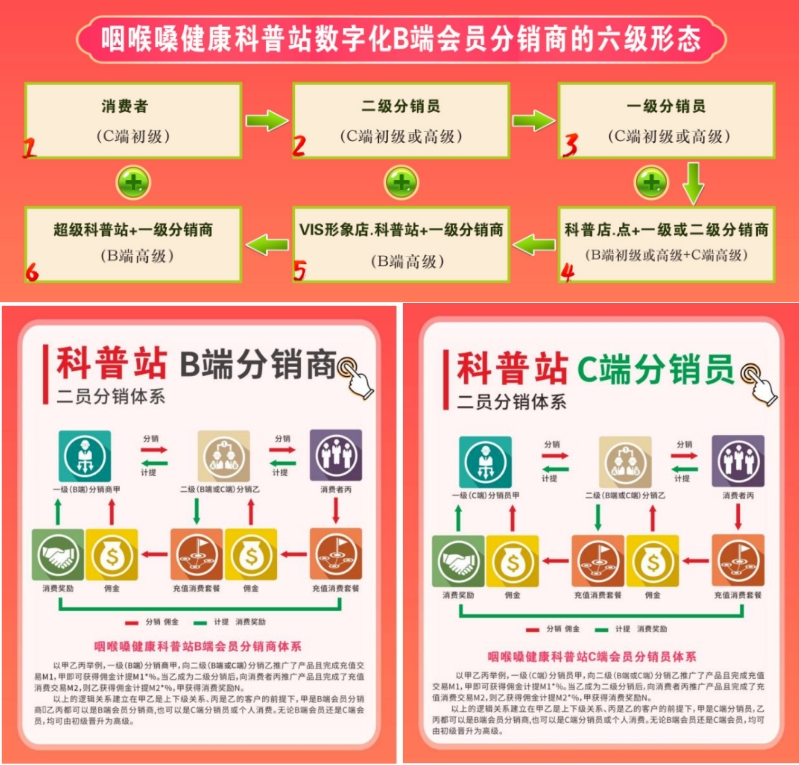 可选择成为“B端会员线下科普站分销商+ C端会员线下个人分销员”或C端会员线上个人分销员。