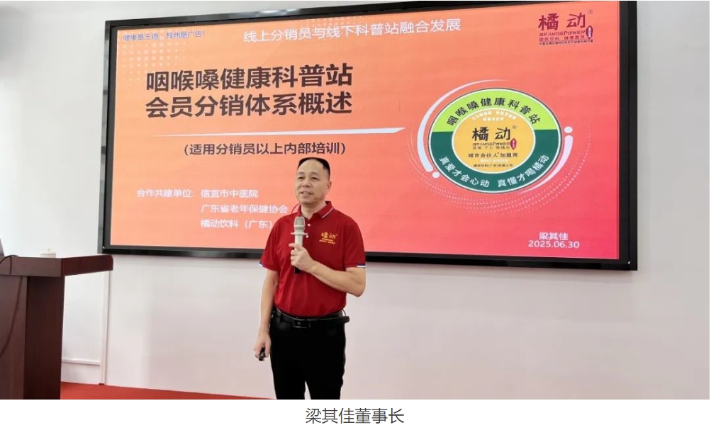 梁其佳董事长就“橘动健康财富共享平台与科普站会员招商发展”作了深度培训和大动员,他说,招商发展咽喉嗓健康科普站会员分销体系,构建橘动健康财富共享平台,是公司新营销战略向纵深推进的重要部署,其发展意义体现在:①发展我们自己的app和小程序;②构建橘动营销的算力和算法;③搭建橘动的分账系统和体验营销共享平台体系;④建立我们自己的营销数据确有权和“1+N”产品生态链体系;⑤构建橘动财富共享平台的万员万企互联;⑥实现线上线下融合发展等。就“咽喉嗓健康科普站会员体系概述”专题培训,系统阐述了橘动健康财富共享平台与橘动科普站的新营销战略,从核心逻辑与应用转化设计及招商发展等作了深度讲述,让消费者成为粉丝,让粉丝成为分销,健康与财富同行,喝橘动健康,卖橘动致富。欢迎大家关注“橘动饮料”和“科普与分销”,欢迎您们参加“橘动健康财富沙龙”。